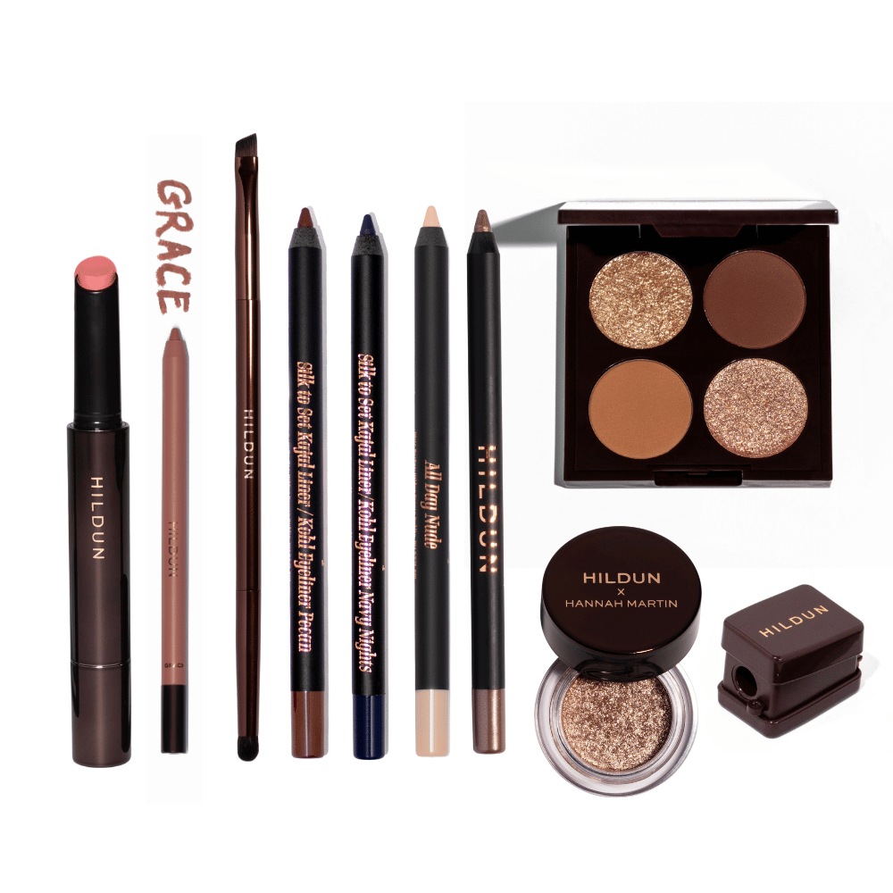 Save 35% on Hildun Beauty's Ultimate Icons! The 5th and final November Edit features newbies, older faves and the best tools. Let's start with the eyes: Silk to Set Kajal liner in shades Pecan and Navy Nights, Immortal Metallic liner in Silver, All Day Nude liner, Naked Diamonds Luxe Quad and Soul Shimmer in shade Sugared Almond for the sparkle. For the lips, we have the stunning Silk to St Longwear lip pencil in shade Grace and to pair beautifully with it, the Melting Moisture lip balm in shade Peachy Pink. This set also comes with our Wing & Smoke Precision eye brush and the best sharpener ever. This is all beautifully packed in our matte black Hildun Beauty gift set. The perfect gift for yourself or any makeup lover!